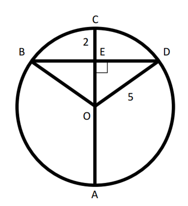 例:In the diagram at theright, circle O has a radius of 5, and CE = 2. Diameter AC is perpendicular to chord BD. What is the length of BD?