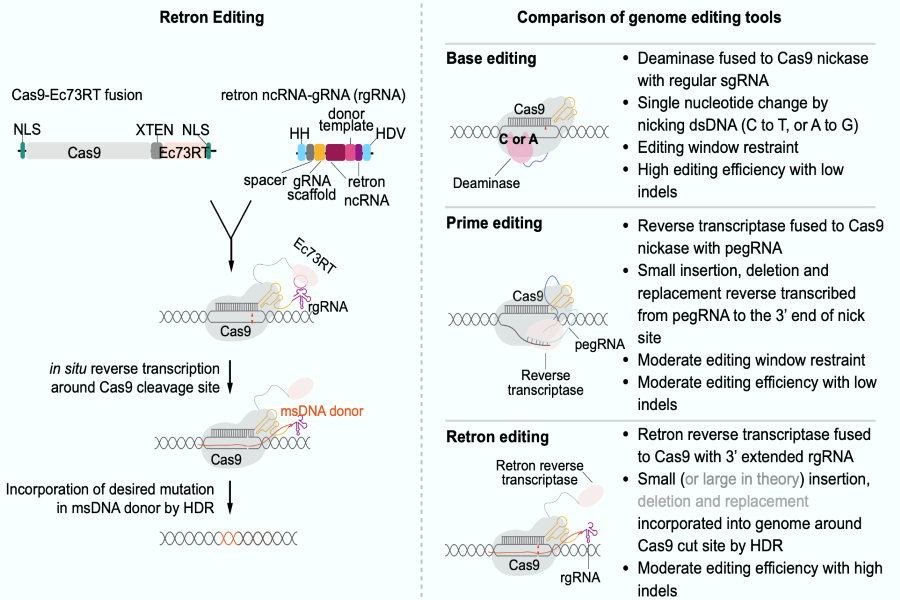 中科院脑智卓越中心杨辉研究组通过将四种已被报道具有功能的retron系统 (Ec48、Ec73、Ec86和Ec107) 在哺乳动物细胞内的表达,证明了细菌retron系统能在哺乳动物细胞中逆转录产生单链DNA。通过将retron RT融合于Cas9蛋白的N端或C端 (RT-Cas9 or Cas9-RT),以及将retron ncRNA连接于sgRNA的5’端或3’端 (5’ rgRNA or 3’ rgRNA),研究人员发现Cas9-Ec73RT和3’ Ec73 rgRNA的组合能最有效的在哺乳动物细胞内完成精准DNA编辑 (~10%编辑效率)。该研究初步探索了Retron editing在哺乳动物细胞中的应用, 验证了Retron Editing用于哺乳动物细胞精准基因编辑的可行性。