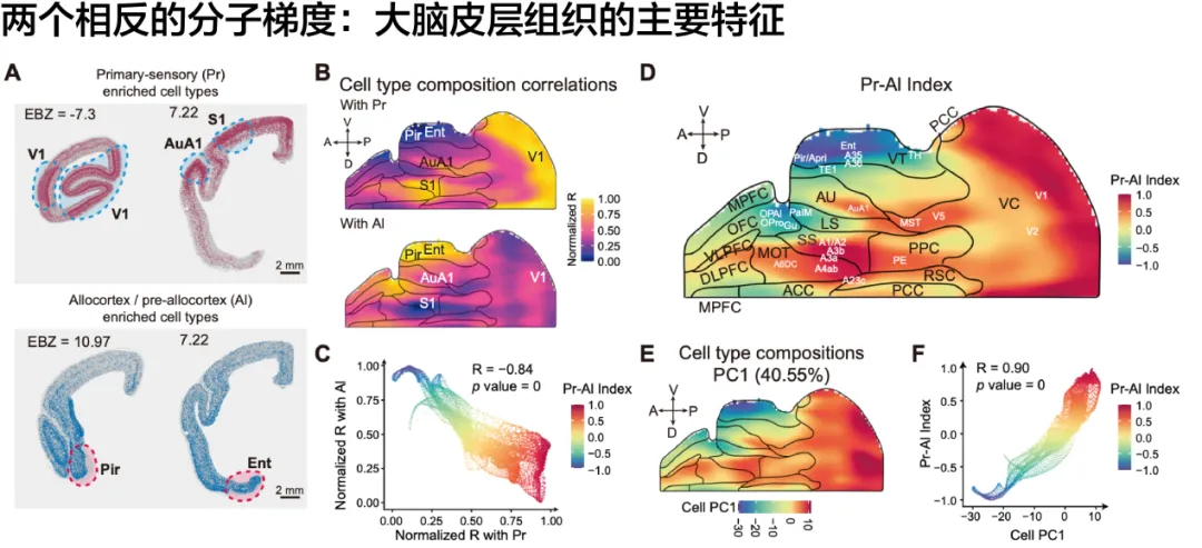 依托这一高精度的全脑整合图谱,研究团队对细胞类型和基因表达的空间分布进行了深入分析。研究显示,皮层中的特异性基因和细胞类型并非随机分布,而是受控于一个全皮层尺度的 “相反分子梯度”: