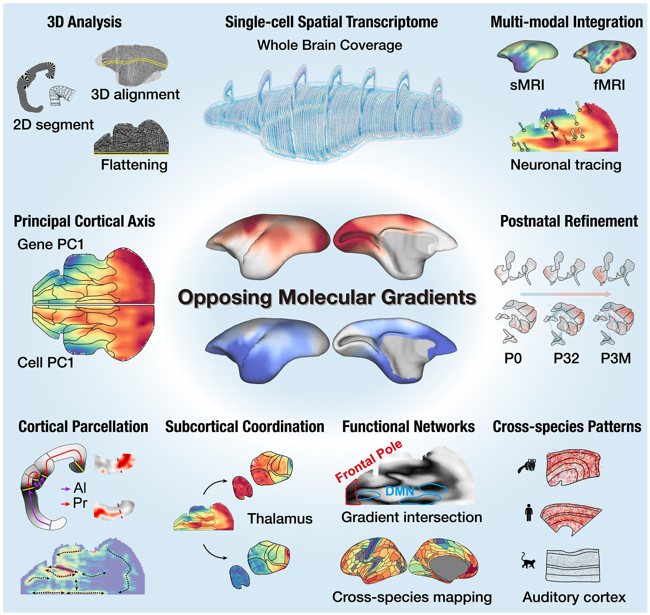 国际灵长类介观脑图谱联盟(International Consortium for Primate Brain Mapping,ICPBM)的创始成员单位,中国科学院脑科学与智能技术卓越创新中心、上海脑科学与类脑研究中心、华大生命科学研究院、澳大利亚莫纳什大学,联合其他科研机构,通过国际合作,整合了空间转录组学、磁共振成像与逆向神经示踪等多模态技术,发现皮层中存在两个起源相反、方向对立的分子梯度,该梯度分别以初级感觉皮层和古/异皮层为锚点,在出生后发育过程中逐渐精细化,不仅刻画了灵长类大脑皮层细胞组成和功能网络的空间架构,还与丘脑的基因表达及丘脑-皮层投射模式高度协同,这一发现为长期以来关于大脑皮层扩张与组织起源的学术争论提供了新的整合性解释。研究成果于2026年4月17日发表在学术期刊《Science》上。中国科学院脑智卓越中心的刘赐融研究员、孙怡迪研究员、杭州华大生命科学研究院郝世杰副研究员、澳大利亚莫纳什大学Marcello G. P. Rosa教授为该论文共同通讯作者。上海脑科学与类脑研究中心单细胞测序平台为研究提供了空间转录组等技术服务与支撑。