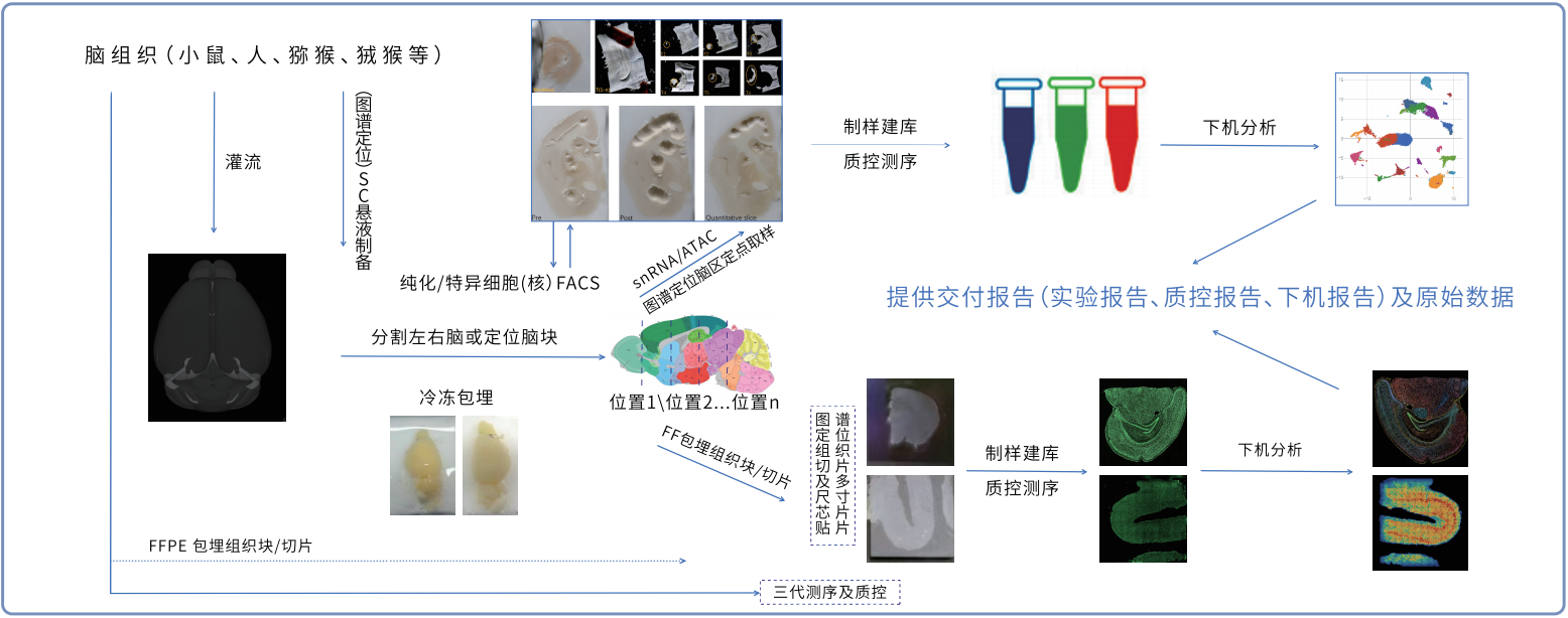 单细胞测序平台致力于打造高质量的研发服务平台,为承担国家重大科研任务的研究团队,提供优质稳定的单细胞转录组、单细胞表观组与空间转录组相结合的多组学技术平台。平台已建立在多物种(鼠、人、非人灵长类)多器官(脑、血管、胚胎、皮肤、类器官)上基于脑图谱精准定位,从活体动物、新鲜/冷冻/石蜡包埋组织、类器官、培养细胞等获取多组学数据的制样测序全流程服务,可以提供的核心服务包括:基于脑图谱定位的脑组织包埋切片取样、单细胞悬液/核样本制备、单细胞转录组及单细胞ATAC制样建库、空间转录组新鲜/石蜡样本制样建库、样品质控、核酸片段质控及单细胞(核)流式分选富集检测、高通量二代测序、纳米孔三代测序等。平台能够为用户提供一站式全流程服务,涵盖实验方案设计、样本前处理、文库制备、质控分选、高通量测序及数据交付。平台已经在多物种多组织样本中获得了稳定优质的数据结果。针对首次合作的团队或新物种、新组织样本,我们提供免费测试和样本前处理培训。